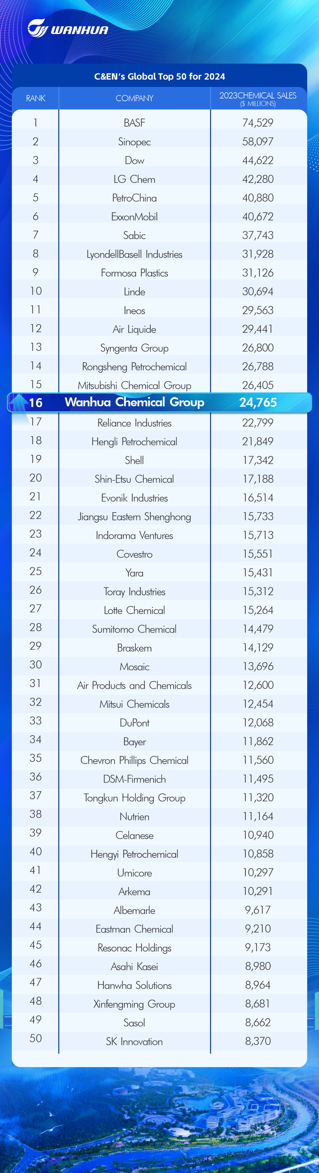 近日,C&EN發(fā)布最新世界化工企業(yè)50強(qiáng)排行榜(Top 50 Chemical Companies),對(duì)全球范圍內(nèi)主要化工企業(yè)進(jìn)行了排名,萬(wàn)華化學(xué)位列第16位,較去年上升2位。