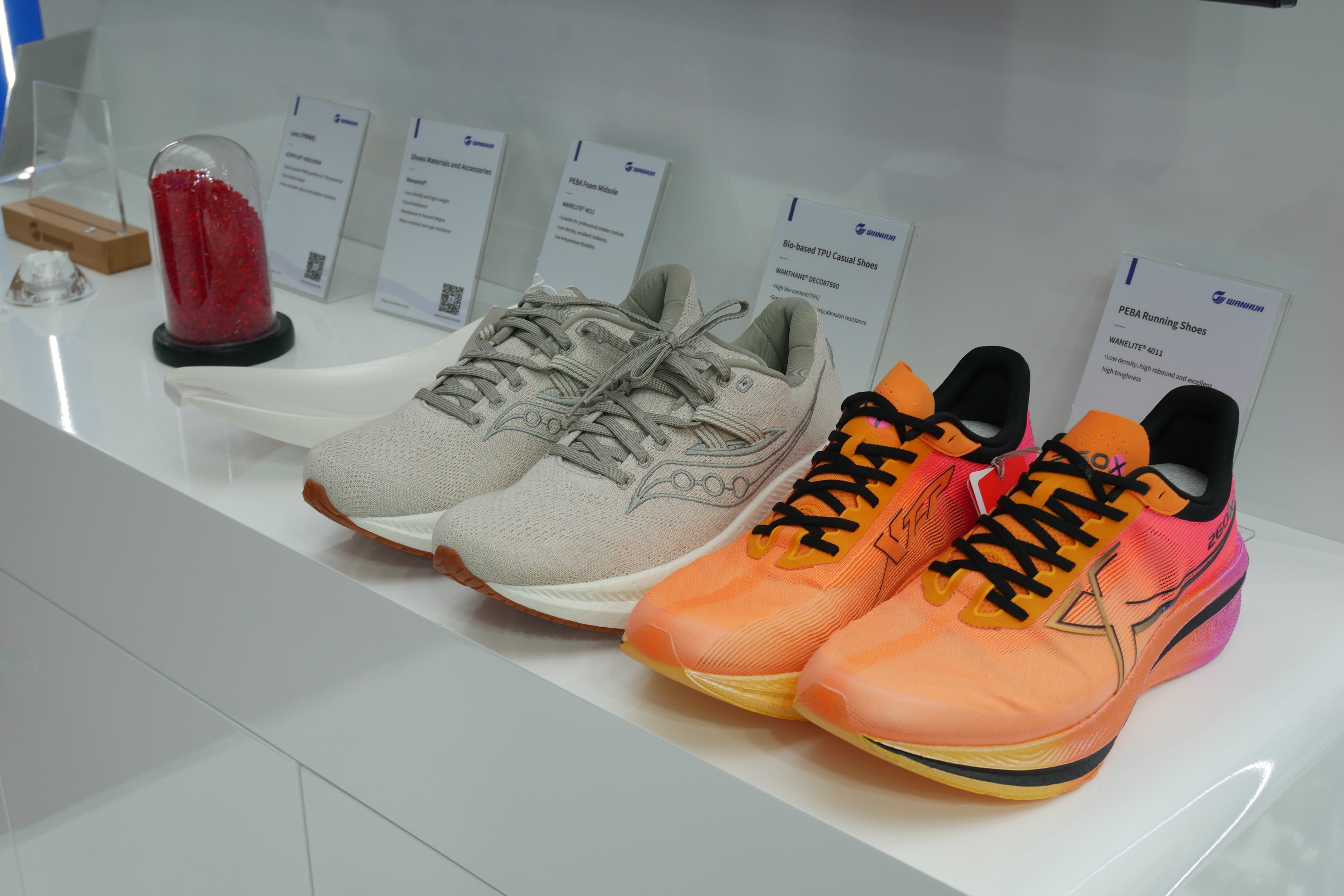 尼龍12產(chǎn)業(yè)鏈進一步豐富了萬華彈性體產(chǎn)品組合,本次展會推出WANELITE®尼龍12彈性體(PEBA),具有超低密度,結(jié)合了彈性和強度。PEBA具有卓越的扭控性和極小的體內(nèi)模數(shù)變化,柔韌性、回彈率高,是目前制造長軸醫(yī)用導(dǎo)管的全球領(lǐng)先材料。其易于加工、低吸水性和低溫靈活性使其適用于廣泛的應(yīng)用,包括高端運動鞋、運動設(shè)備、電子、工業(yè)應(yīng)用和醫(yī)療等。
