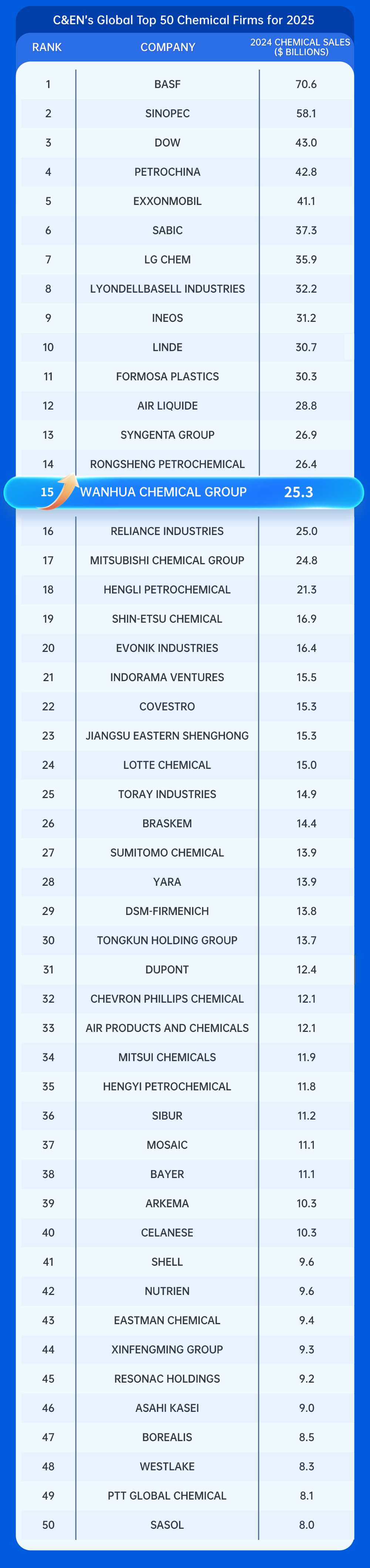 7月23日,C&EN(《化學(xué)與工程新聞》)發(fā)布最新全球化工企業(yè)50強(qiáng)排行榜(Global Top 50 Chemical Firms),對(duì)全球范圍內(nèi)主要化工企業(yè)進(jìn)行了排名,萬華化學(xué)位列第15位,較去年上升1位。