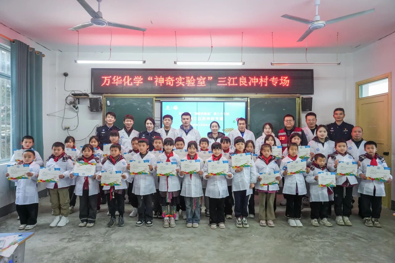 活動現(xiàn)場,神通科技旗下吉光品牌聚焦學(xué)生視力健康,不僅捐贈多臺護眼設(shè)備,還帶來實用的護眼知識科普,以專業(yè)力量守護孩子們的明亮雙眼;萬華化學(xué)也為孩子們準(zhǔn)備了多款自產(chǎn)環(huán)保材料打造的筆本套裝、日用水杯、羽毛球、頸枕及愛心書籍等物資,助力孩子健康成長。同時將公司大型化學(xué)科普項目 “神奇實驗室” 帶到現(xiàn)場,在高玉壯博士的帶領(lǐng)下,同學(xué)們在一個個簡單的實驗里,直觀感受化學(xué)與生活的緊密關(guān)聯(lián),沉浸體驗化學(xué)世界的奇妙魅力。